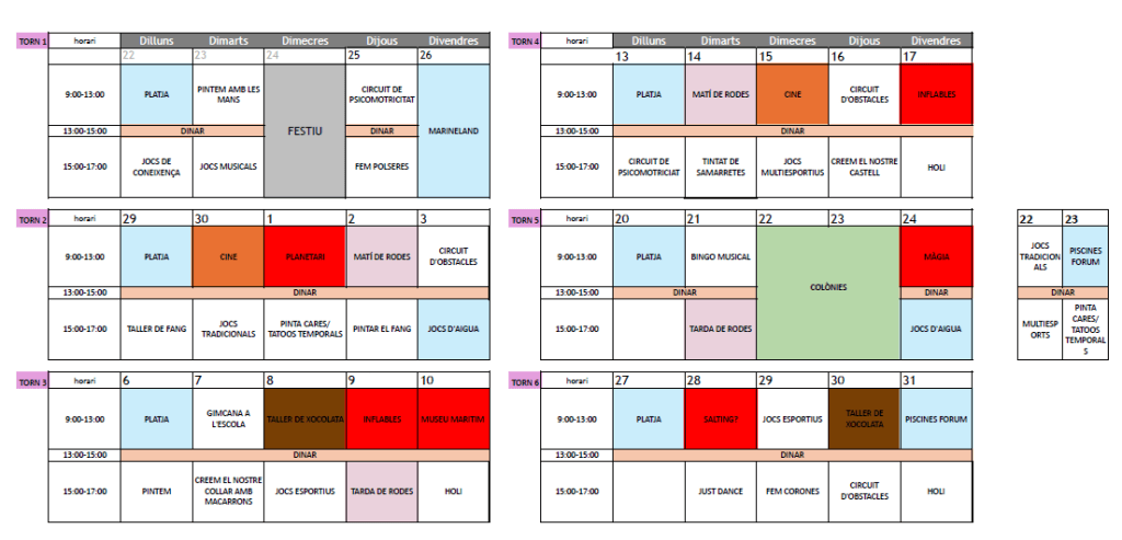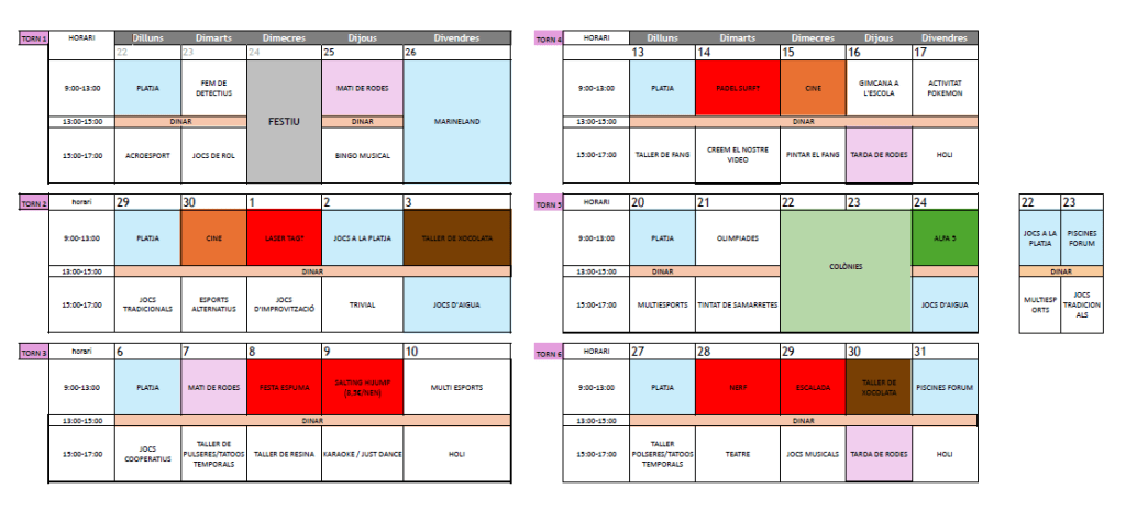 El casal inclou una programació variada i engrescadora, adaptada per edats, amb activitats com sortides, tallers, jocs d’aigua, platja, gimcanes, activitats esportives i moltes més propostes per passar-ho bé durant les vacances. També s’han compartit els calendaris diferenciats per als grups de grans (de 1r a 6è) i petits (d’I3 a I5).